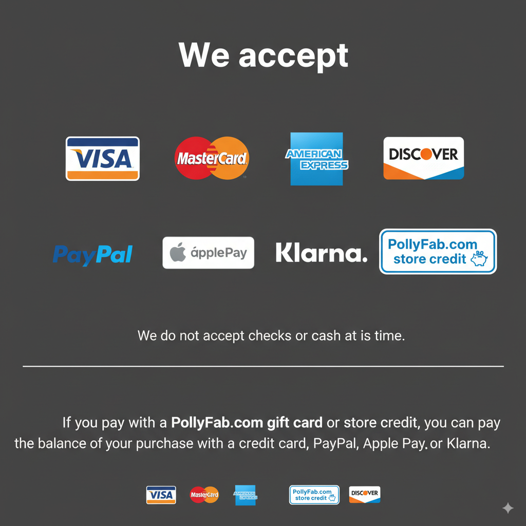 We accept Visa, MasterCard, American Express, Discover, PayPal, Apple Pay, Klarna, PollyFab.com gift cards, and PollyFab.com store credit. We do not accept checks or cash at this time. If you pay with a PollyFab.com gift card or store credit, you can pay the balance of your purchase with a credit card, PayPal, Apple Pay, or Klarna.